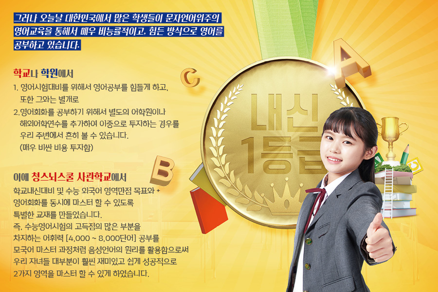 ¹Ý¸é¿¡, Çѱ¹ÀÇ ÇлýµéÀº ÃʵîÇб³ ¶§ 800´Ü¾î, ÁßÇб³ ¶§ 2,000~3,000´Ü¾î, °íµîÇб³ ¶§ 4,000´Ü¾î ¾à 8,000´Ü¾î¸¦ ¾Ï±âÇÕ´Ï´Ù. ¾Ï±â¸é¿¡¼´Â ±× ¾î¶² ³ª¶ó º¸´Ùµµ ¿µ¾î ±³À° ½Ç·Â¿¡ µÚÁöÁö ¾Ê½À´Ï´Ù. ÇÏÁö¸¸ ¿µ¾îȸÈ, ÇÁ¸®ÅäÅ·, ÀÚÀ²¿µ¾îÀÛ¹®À» ÇÏ´Â ¸é¿¡¼´Â ÀÀ¿ë´É·Â & ½Ç¿ë´É·ÂÀÌ ¶³¾îÁý´Ï´Ù.